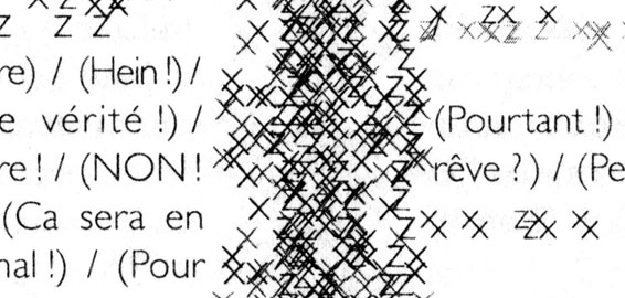 (et ce bruit, tout ce bruit, ces voix, ce vacarme, la rue, ce grouillement, le reste, et le reste, tout le reste ; qui maintenant, ici, tapent, entrent partout, claquent, hurlent, bon, deux mégots dans les oreilles, en rire, non, mais poursuivre…) (Heidsieck, 1968)