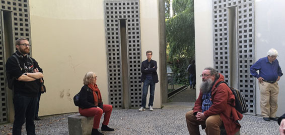 Le fait d’arpenter le terrain, toutes oreilles ouvertes, prend quant à lui sa source dans la pratique des soundwalks, que l’artiste new-yorkais Max Neuhaus a érigés en œuvres d’art, actions performatives, collectives, relationnelles autant que perceptuelles. Nous avons ici affaire à la construction d’une « œuvre de concert » en marchant et écoutant, dans les pas de John Cage – qu’admirait beaucoup Max Neuhaus. L’artiste avait d’ailleurs commencé à partitionner ses soundwalks comme des marches reproductibles. Nous y reviendrons ultérieurement.